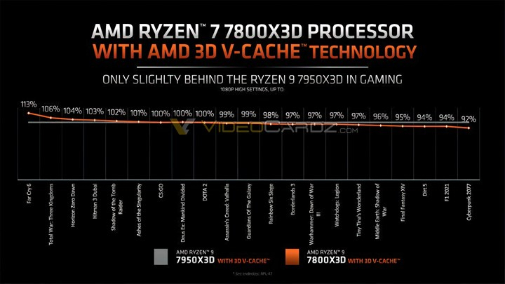 AMD, Ryzen 7 7800X3D işlemcisinin şimdiye kadar birinci nesil Ryzen 7 5800X3D ile olan performans karşılaştırmalarını ve Intel’in Core i9-13900K ile olan kıyaslamalarını yayınladı. Artık ise AMD’nin resmi bir slaytı sızmış durumda. Bu görselde Ryzen 7 7800X3D ile Ryzen 9 7950X3D’nin performans karşılaştırması bulunuyor.