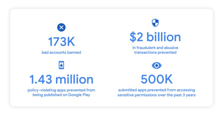Kaliforniyalı şirket ayrıyeten hizmetin siyasetlerini ihlal eden 1.43 milyon uygulamanın Google Play’de yayınlanmasını engellediğini söylüyor. Raporda, 2 milyar dolardan Çok hileli ve Üzücü niyetli finansal sürecin önlendiğine dair bilgilere de yer verildi.