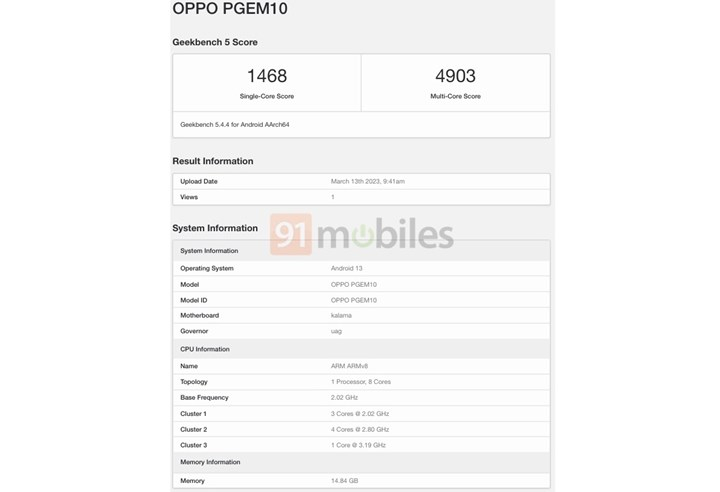 Kıyaslama platformunda ”PGEM10” model numarası ile görüntülenen Oppo Find X6 Pro, 16GB RAM ve Android 13 işletim sistemine ek olarak üç çekirdeği 2.02GHz, dört çekirdeği 2.80GHz ve birincil çekirdeği 3.19GHz’de çalışan Yekün sekiz çekirdekli bir yonga setinden dayanak alıyor. Bu konfigürasyonun amiral gemisi Snapdragon 8 Gen 2′ye karşılık geldiğini söyleyebiliriz. Hakikaten yeni aygıt, Geekbench’in Biricik çekirdekli ve Fazla çekirdekli testlerinde sırasıyla 1.468 ve 4.903 puan alıyor.