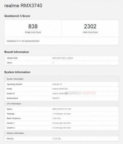Tekli çekirdek testinde 838 skorunu elde eden Realme 11 Pro+, çoklu çekirdek testinde 2302 skoru ile karşımıza çıkmakta. Aygıt listede 2.6 GHz’de iki çekirdek ve 2.0 GHz’de altı çekirdekle ortaya çıktığı için MediaTek Dimensity 7050 yonga setinden Güç alması hayli beklenen.