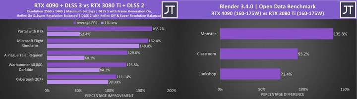 Günümüzde RTX 40 taşınabilir serisi için inceleme ambargosu devam ediyor. Lakin DLSS 3.0 tabanlı testler için rastgele bir sınırlama var değil. Bununla Birlikte Intel Core i9 13950HX ve 32 GB DDR5-5600 dayanaklı Razer Blade 16 üzerinde test edilen RTX 4090 taşınabilir, Portal with RTX, Microsoft Flight Simulator, A Plague Tale: Requiem, Warhammer 40,000: Darktide ve Cyberpunk 2077 üzere oyunlarda selefi RTX 3080 Ti taşınabilir ile karşılaştırıldı.