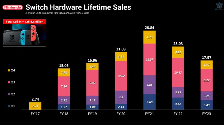 Görünüşe nazaran Nintendo‘nun 2023’te yahut 2024’ün başlarında yeni bir Switch modeli piyasaya sürme planı yok. Japon yayın kuruluşu Nikkei Asia’ya konuşan kaynaklar, “yeni bir Eser lansmanının en erken önümüzdeki ilkbahardan Evvel gerçekleşmeyeceğini” söyleyerek bu noktayı yine teyit ederken, Nintendo’nun mali tablolarına kısa bir nazar atmanın bile bunu doğrulayacağını Anlatım ediyorlar. Nintendo’nun finansal datalarına nazaran azalan donanım ve yazılım satışlarının tesiriyle net satış gelirlerinde 3 milyar dolardan Çok bir düşüş yaşadı. Switch sevkiyatları da 5 milyon adet azaldı ve sevkiyatlar satışlara eşit olmasa da, Nintendo satışların da azaldığını doğruladı ve bu da 1,7 milyar dolarlık donanım çıkarının düşmesine neden oldu.